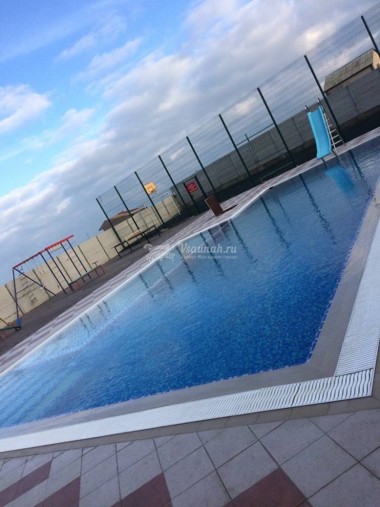 Охладиться после жаркого парения можно в большом открытом переливном бассейне с горкой (7x14 метров), вода в котором фильтруется с помощью самого современного оборудования, поэтому всегда остается кристально чистой. А для тех, кто не любит сильный контраст температур, в сауне имеется два душа.